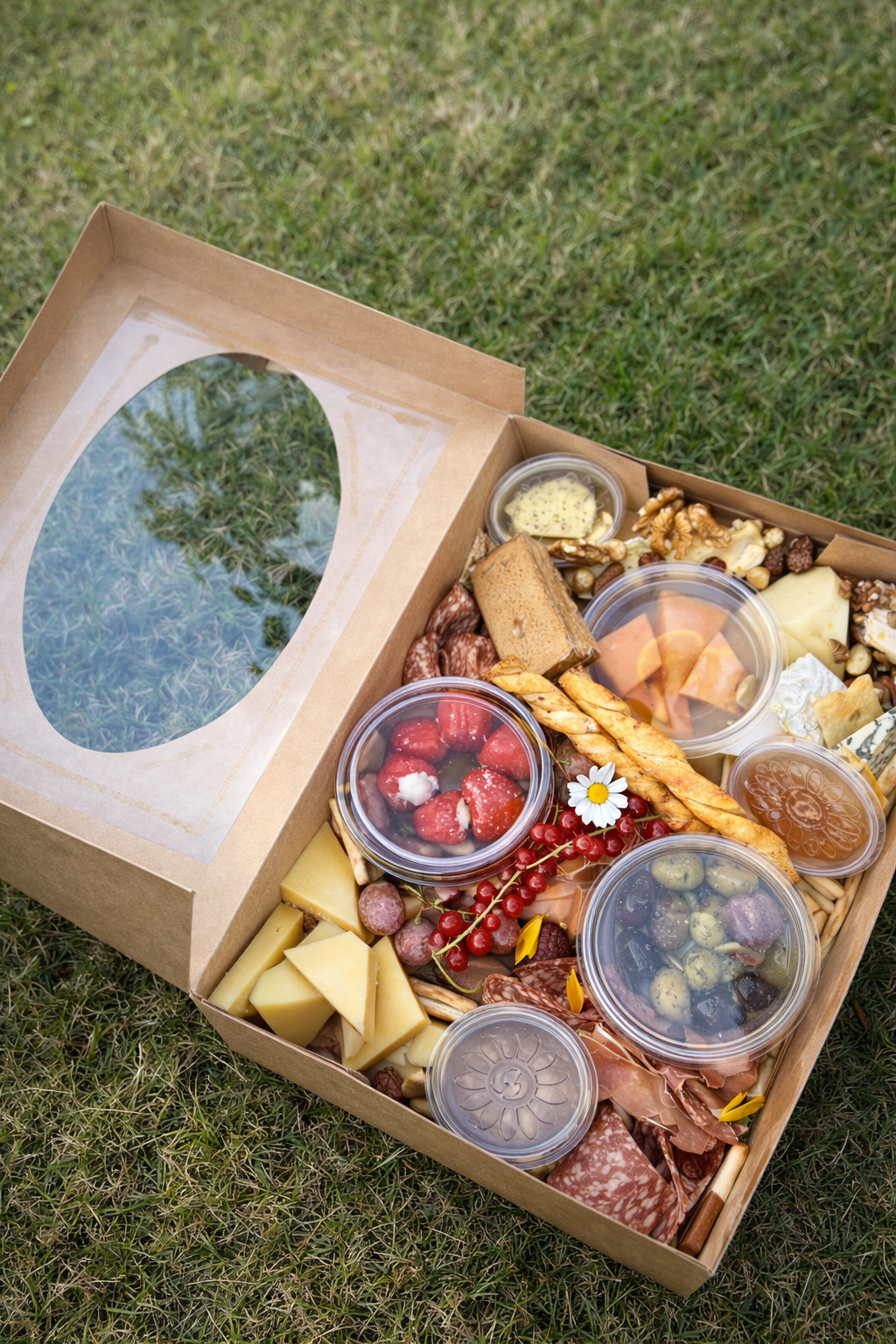 Een grote luxe box voor 5 personen €75 – rijk gevuld met verfijnde kazen, charcuterie, smaakvolle dips, noten en bijpassende borrelcrackers.